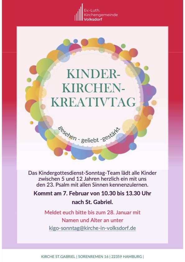 Kinder-Kirchen-Kreativtag, 7.2.2026, 10.30 -13.30 Uhr 5. Februar 2026 Am Vormittag von 10:30 bis 13:30 ist wieder ein Kinder-Kirchen-Kreativtag vom Kindergottesdient-Sonntag-Team. Herzliche Einladung!